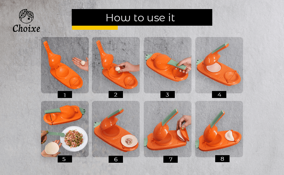 Easy-to-use. Put the dough on the dumpling maker set; pull down the handle and press the dumpling/empanada wrapper. Add your favorite fillings on the dumpling skin; then close the pressing mold to get a perfect piece.