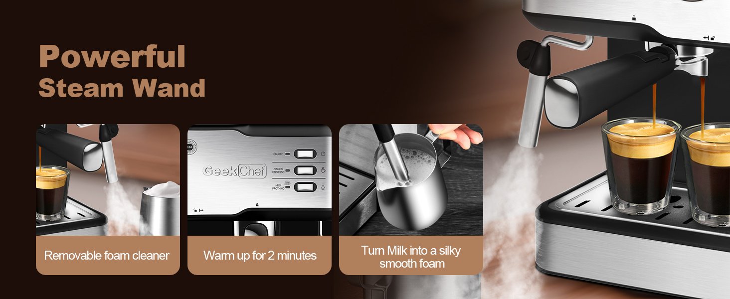 2.PROFESSIONAL MILK FROTHING WAND: Frothing milk for cappuccino and latte by hot steam wand. The steam wand rotate degrees, which can produce silky and smooth milk foam better.
