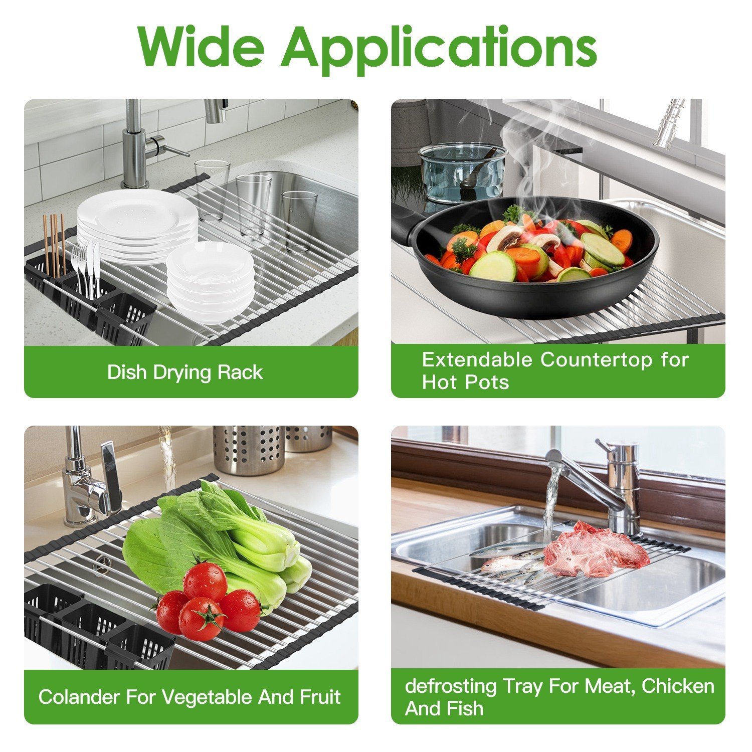 *Multiple Use*:A practical multipurpose kitchen working station you must have!Not only a stretchable dish drying rack,but also can be used as colander for vegetable and fruit,defrosting tray for meat,chicken and fish,extended countertop for meal preparation.