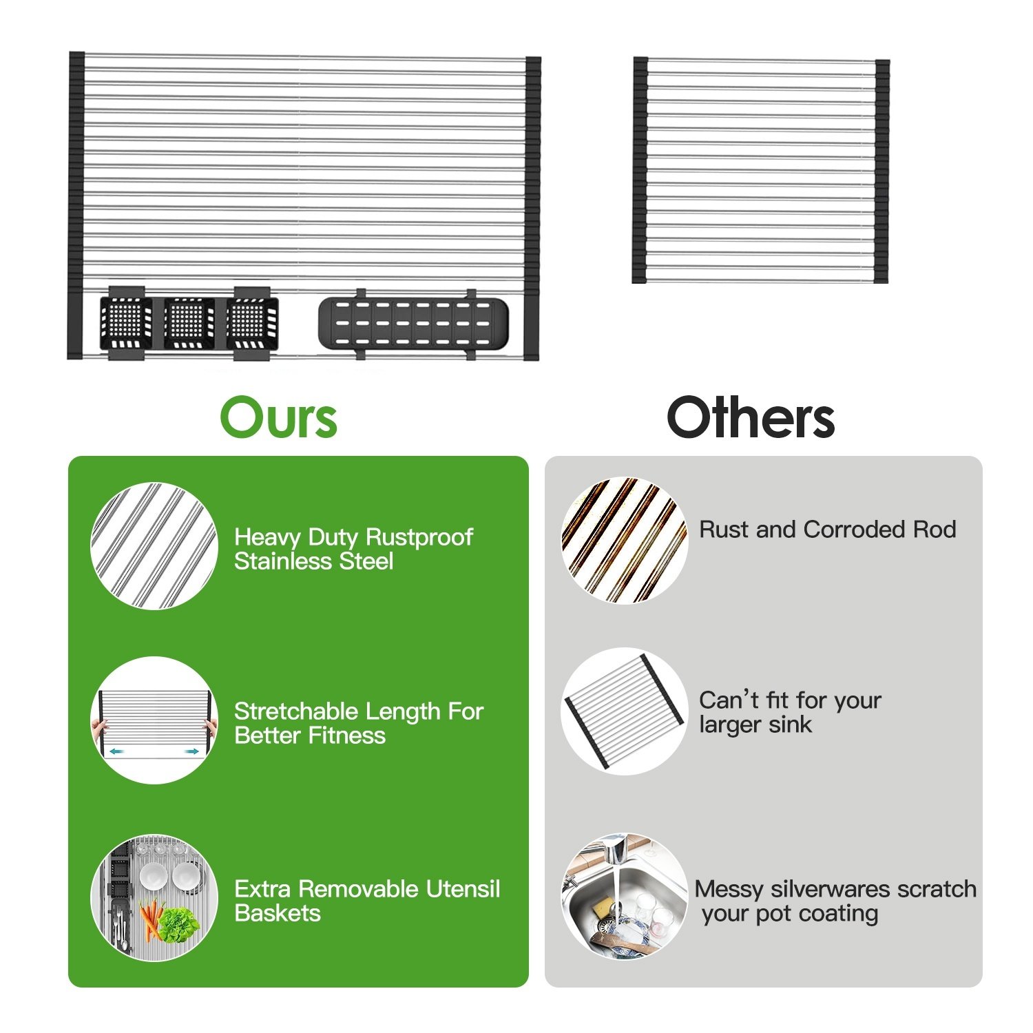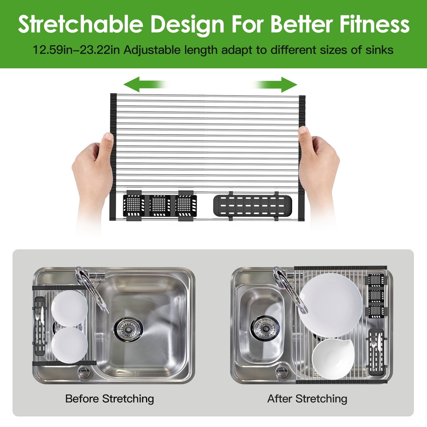 *Stretchable Dish Drying Rack*:Compared to others dish drying rack,our retractable dish drying rack featured with conveniently stretchable rods can be flexibly adjusted the length from 12.59in to 23.22in to accommodate to different sizes of sinks and counter,resulted in better fitness. Please carefully measure your sink before purchasing for better organization effect.