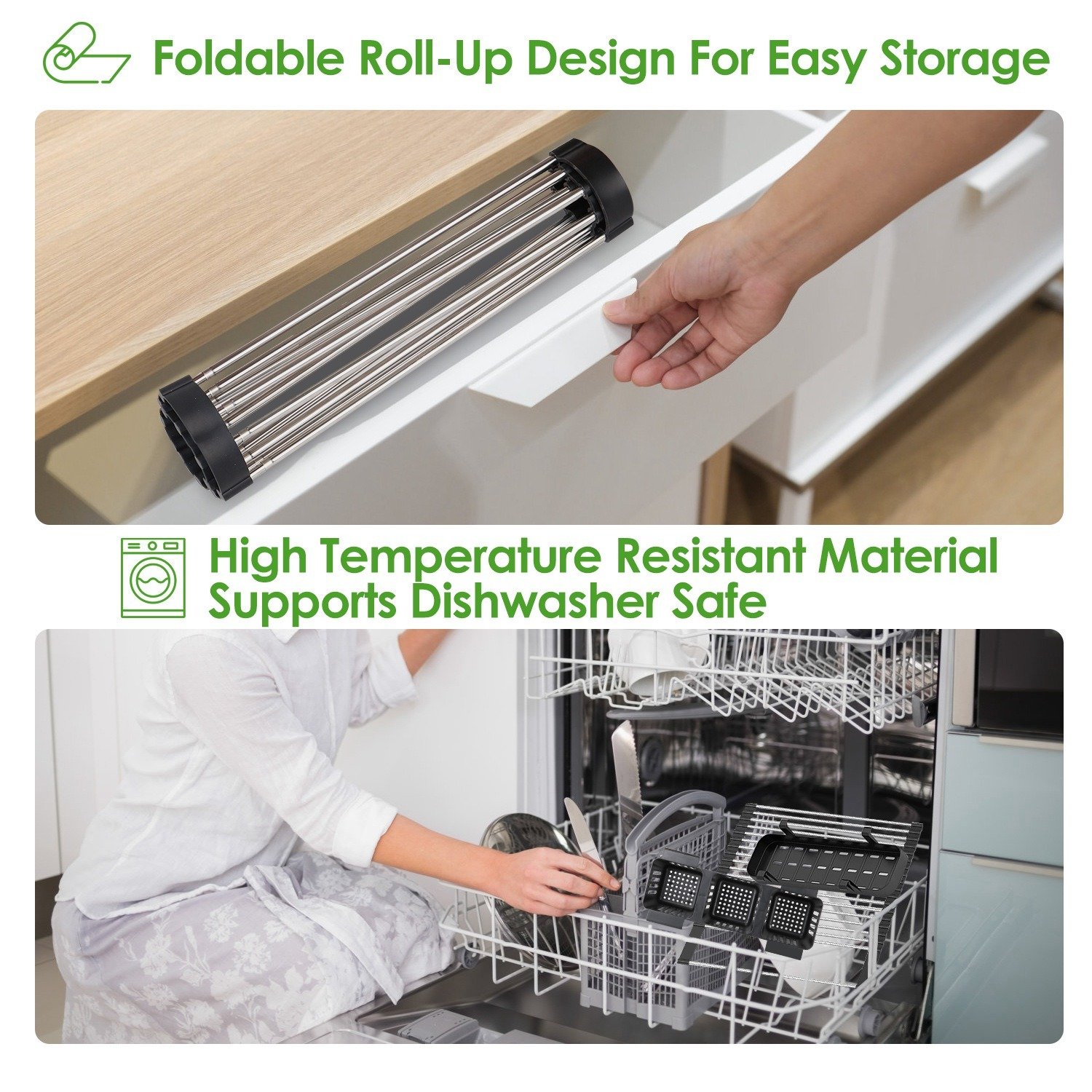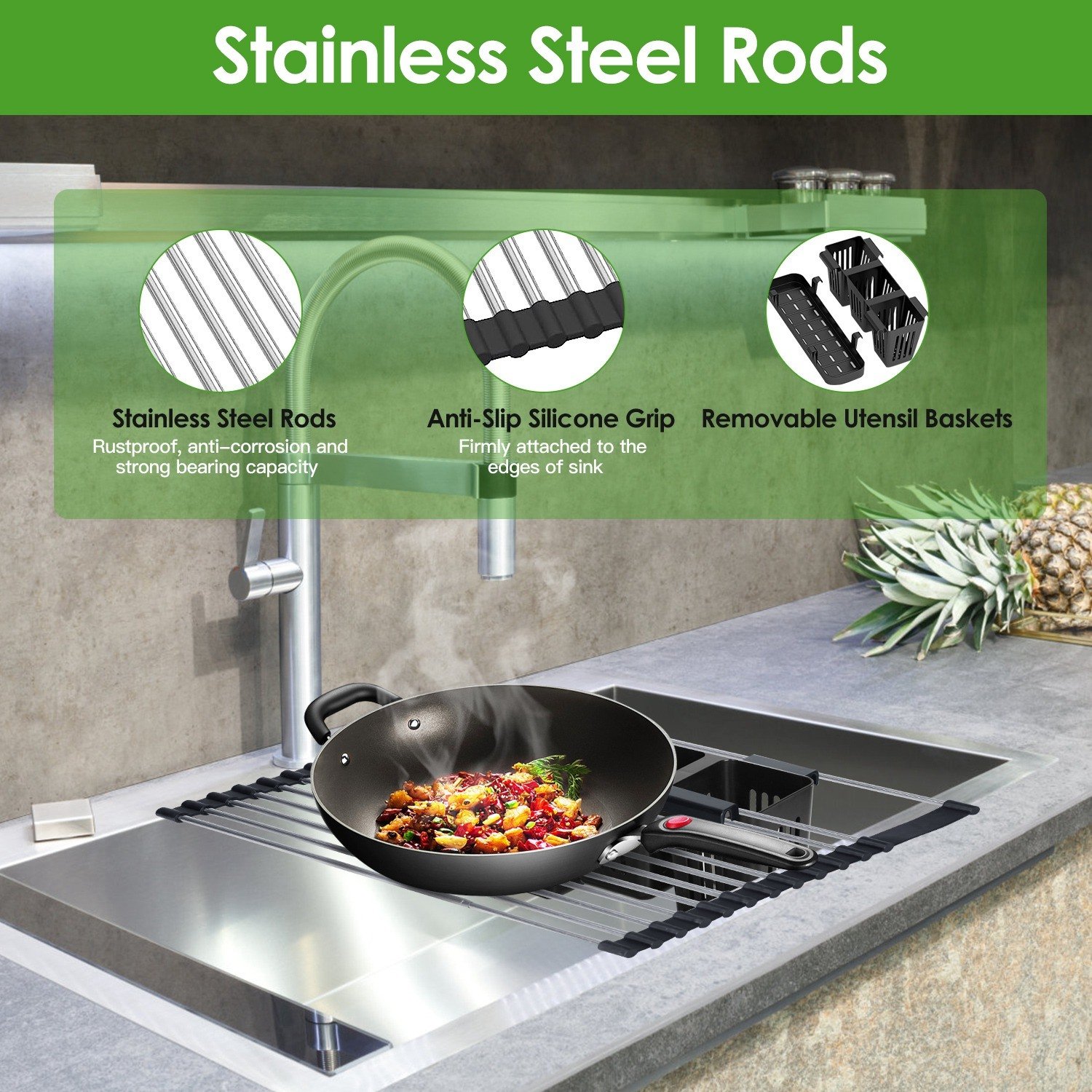 *Durable & Sturdy Material*:Constructed by corrosion-resistant,rustproof 201 stainless steel rods,this sturdy rolling-up dish drying rack can bear up to 40lbs capacity,you can put your heavy pots and pans or cutleries in confidence. Anti-slip silicone grips on both sides can be firmly attached to the edges of sink. Moreover,high temperature resistant material makes this foldable dish drying rack is dishwasher safe,saving your time and effort to clean.(Please remove the utensil baskets before washing by dishwasher.)