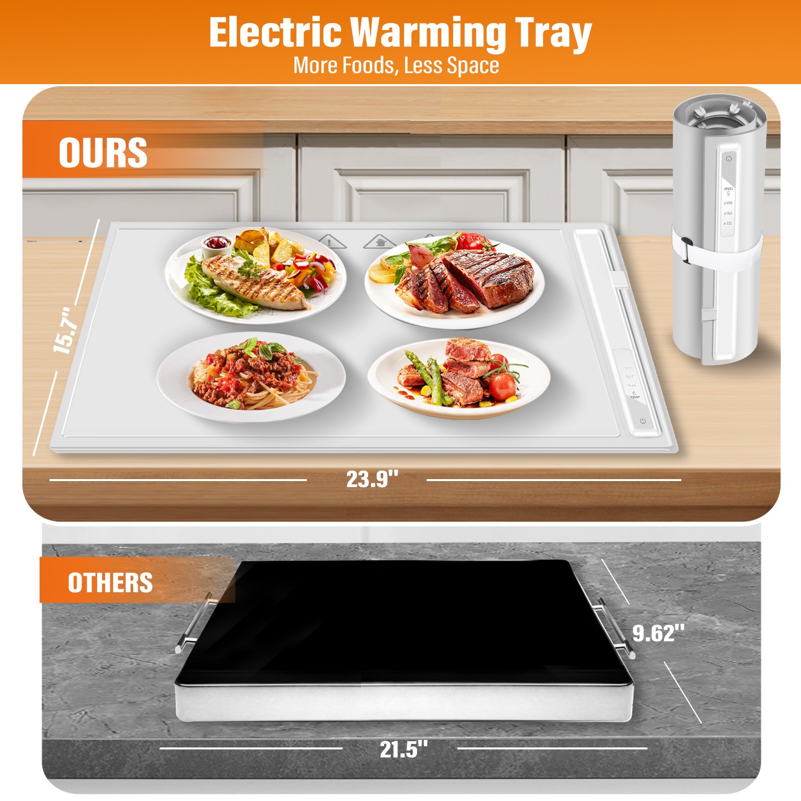.COMPACT & PORTABLE STORAGE: Roll up portability and effortlessly save space. Roll up your food warming tray for convenient storage, making it an ideal companion for your on-the-go lifestyle